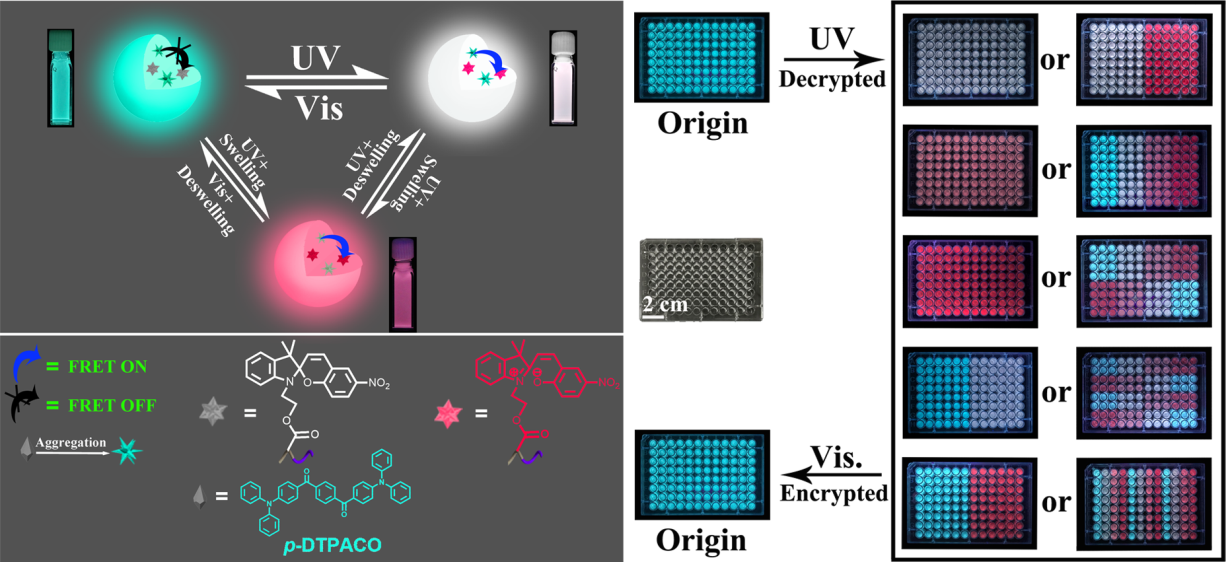 近日,太阳集团tyc539理论有机化学与功能分子教育部重点实验室的陈建教授研究团队报道了利用细乳液聚合法,将具有AIE效应的给体荧光染料 1,4-苯基-双((4-二苯胺基)苯基)甲酮( p -DTPACO)和受体(螺吡喃)及单体(苯乙烯)共聚合制备新型双色光开关荧光聚合物纳米粒子。结果表明,通过优化给体-受体比例,该聚合物纳米粒子具有光和溶剂可调的开关对比度和发光颜色。另外,该团队还利用调控FRET效率的策略成功制备了具有开关可调至稳定白光的纳米粒子,并进一步将上述光开关荧光聚合物纳米粒子应用于数据加密。该研究对光开关荧光纳米材料在数据加密,显示照明和生物成像等领域具有潜在应用价值。