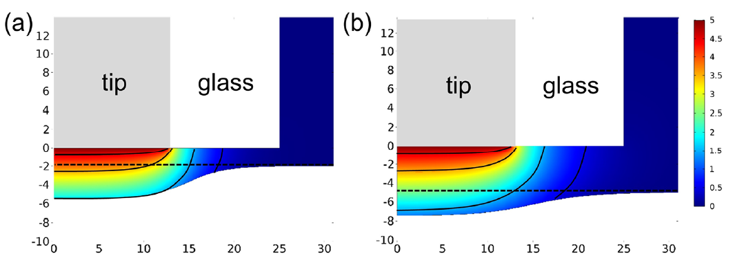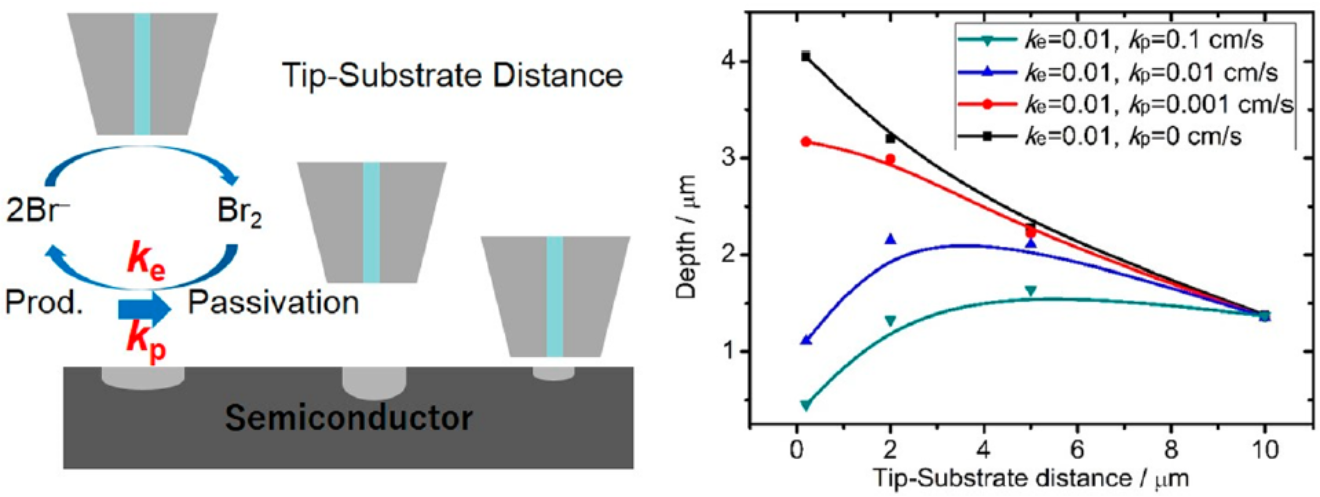 基于半导体的纳米制造在微机电系统、大规模集成电路、光电和光伏器件等领域都有着巨大应用。基于接触模式的超精密机械加工和基于高能束的激光和聚焦离子束直写都不可避免的对脆性半导体材料造成表面损伤和成分改变。基于电化学诱导的微区化学刻蚀具有化学反应温和、无热效应、非接触、无掩膜的优点。然而电化学诱导化学刻蚀涉及刻蚀反应与钝化反应的耦合,同时针尖基底距离也将显著改变反应耦合效应,从而影响刻蚀效率与分辨率。张杰博士课题组将微区刻蚀形貌分析与有限元模拟相结合,研究针尖基底距离与微区刻蚀反应和钝化反应的耦合关系。结果表明刻蚀分辨率主要受针尖基底距离控制,而刻蚀效率主要受刻蚀反应速率控制。因此当钝化反应可以忽略时,纳米尺度的针尖基底距离是高刻蚀效率和分辨率的保障。当钝化效应十分显著时,合适的针尖基底距离以保障钝化产物的扩散,同时牺牲一部分刻蚀分辨率是必要的。上述研究方法与结论对电化学微纳加工技术的工艺优化具有指导作用。