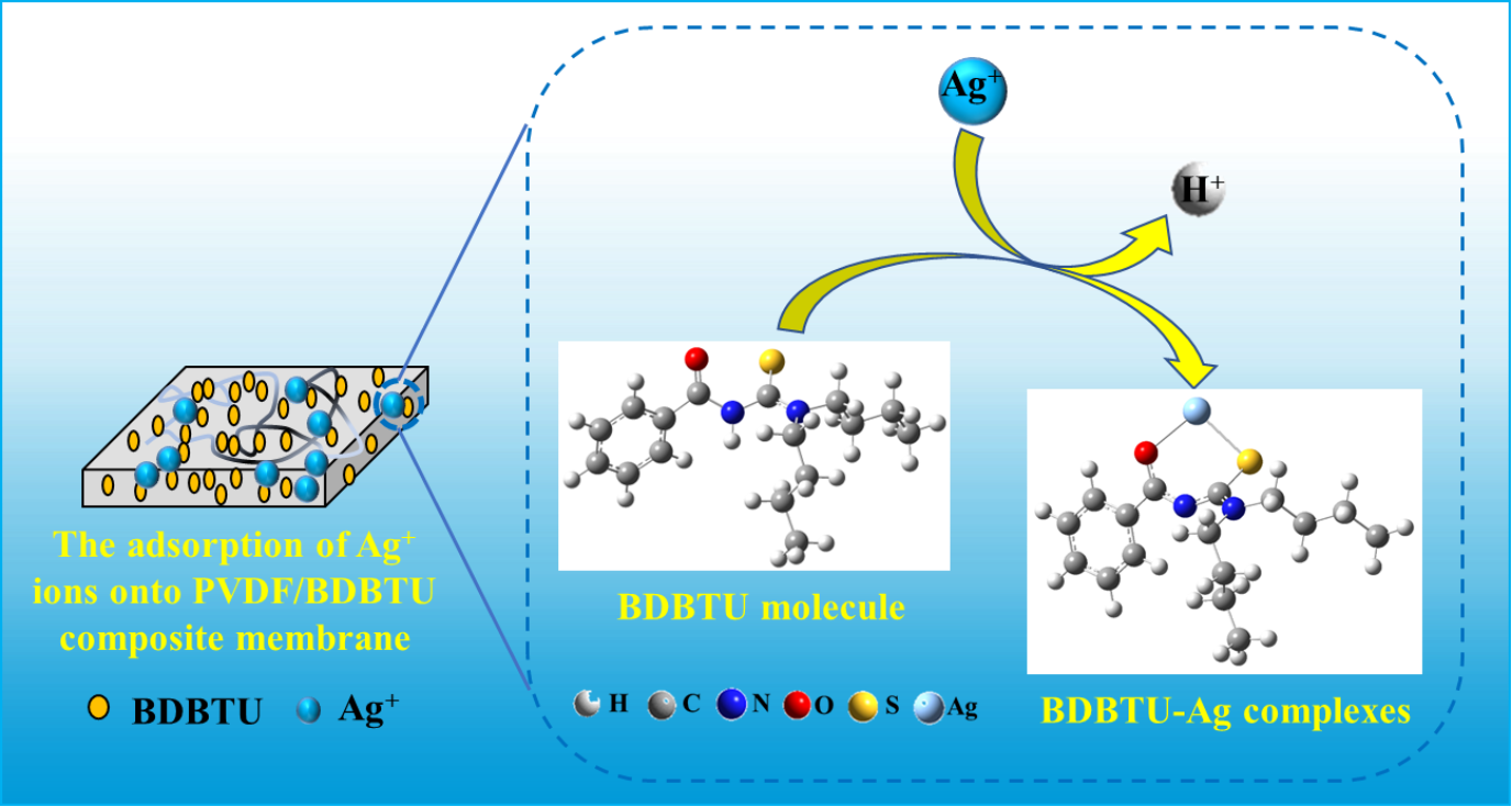上述相关成果以“Fabrication of polyvinylidene fluoride and acylthiourea composite membrane and its adsorption performance and mechanism on silver ions”为题发表在中科院一区top期刊Separation and Purification Technology(IF:9.136)。黄小平博士为文章第一作者和通讯作者,公司2019级研究生金凯为第二作者,曾坚贤教授为共同通讯作者。该工作得到湖南省自然科学基金(No. 2022JJ30238,2021JJ40202, 2021JJ40193)、湖南省教育厅重点项目(21A0291)、湖南省教育厅一般项目(20C0769)和湖南省老员工创新训练项目(S202210534021)的支持。(全文链接:https://doi.org/10.1016/j.seppur.2023.123675)