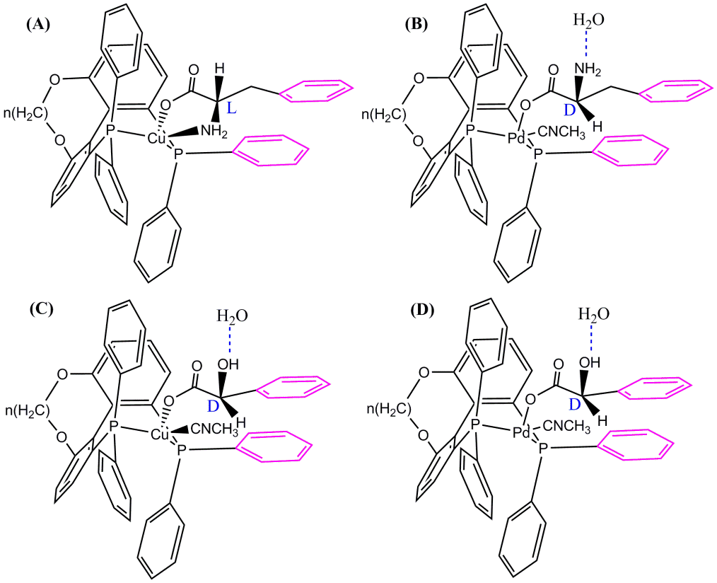 此外,课题组首次对轴手性双膦配体识别氨基酸(扁桃酸)对映体可能的机理进行了探讨。配体和底物结构中苯环间的π-π作用、-COO-与金属离子的配位作用是手性识别过程中的两个重要作用位点,Cu(I)与Pd(II)四配位体不同的立体构型是CnTunaPhos-Cu和CnTunaPhos-Pd对DL-氨基酸(扁桃酸)具有不同识别能力的主要原因。