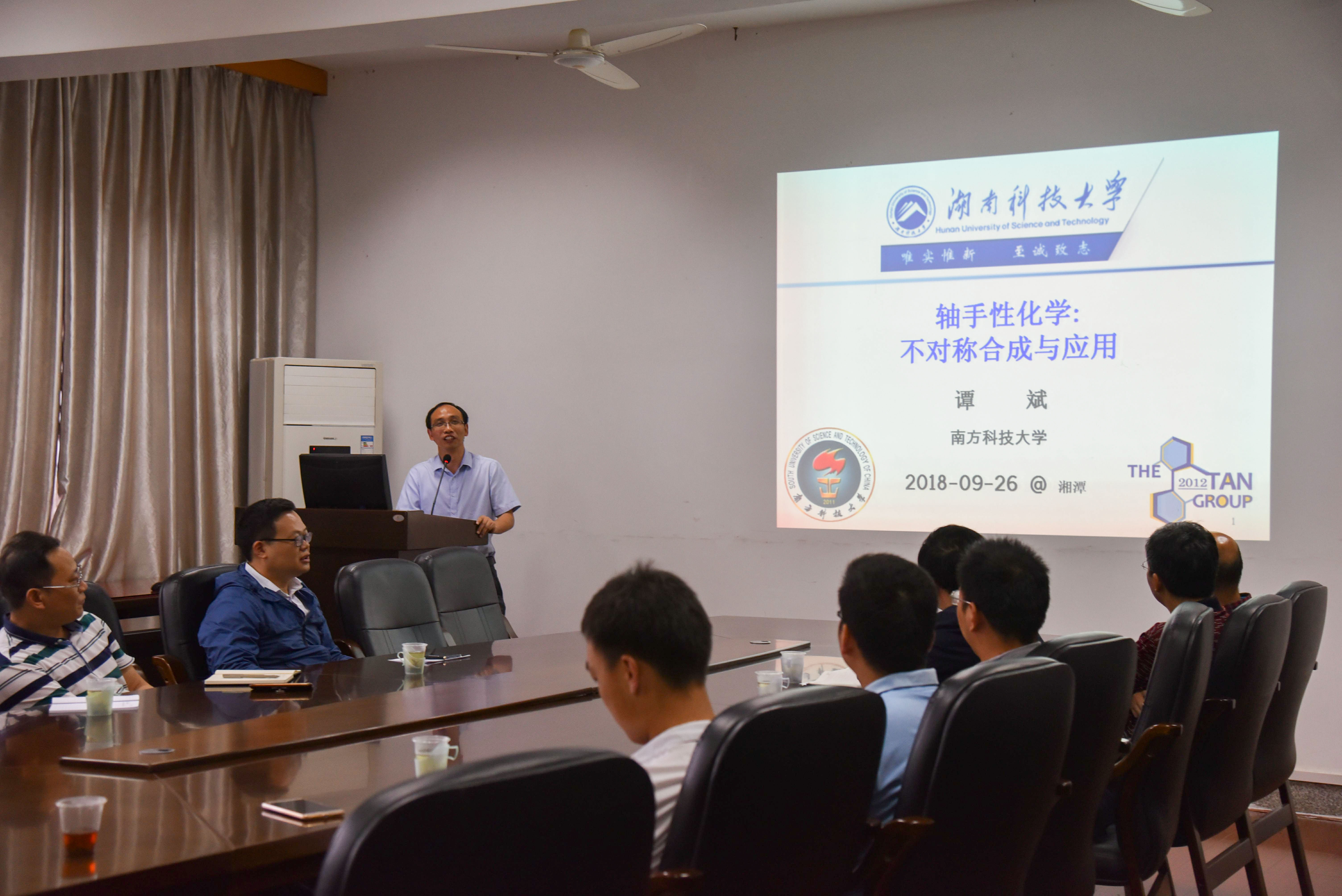2018年9月26日下午,应太阳集团tyc539和理论有机化学与功能分子教育部重点实验室的邀请,国家杰出青年基金获得者谭斌教授在化工楼三楼学术报告厅以“轴手性化学:不对称合成与应用”为主题,做了一场精彩的学术报告。太阳集团tyc539师生、理论有机化学与功能分子教育部重点实验室科研人员等到场聆听。此次报告会由公司周虎书记主持。