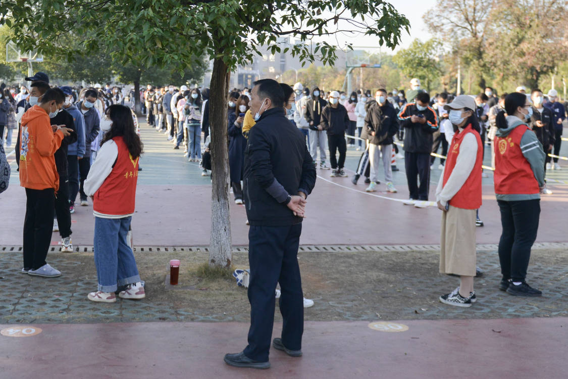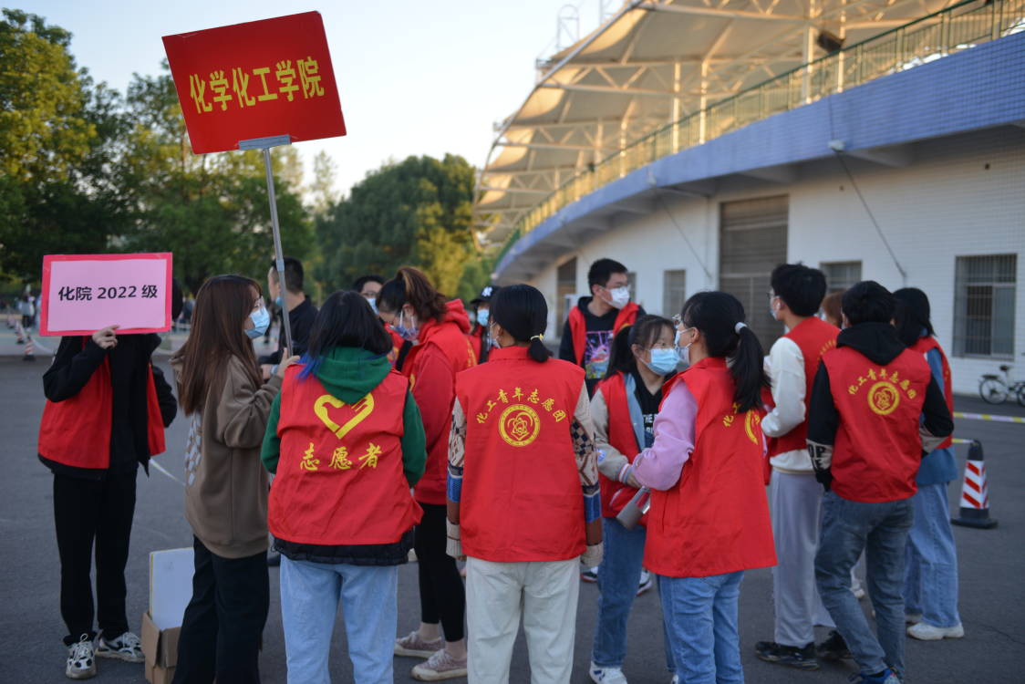 19级辅导员曹小玉老师、20级辅导员郝洪美老师、21级辅导员陈小庭老师、22级辅导员曹文星老师也来到核酸采样现场,组织引导同学们有序采样。老师们手拿喇叭,在采样进口处和队列中引领同学们找到自己的班级,帮助同学们尽快完成核酸采样。陈小庭老师在采样进口处细心叮嘱每一位员工耐心等候、有序进场,提醒同学们戴好口罩,保持一米间距。曹文星老师、曹小玉老师和郝洪美老师在核酸队列中引导同学们以班级为单位有序候场,遵守秩序,带领同学们主动配合防控工作。此外,还有公司志愿者们身穿红马甲,和老师们一起协调好候场秩序,检查同学们的健康码,组织大家顺利完成医护人员的采样工作。