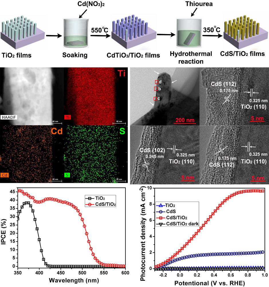 最近,我们将此策略运用到合成TiO2基异质结光阳极(TiO2→CdTiO3/TiO2→CdS/TiO2),与传统方法制备的CdS/TiO2异质结光阳极相比,原位相转换制备的CdS/TiO2异质结光阳极具有优异的光电化学性能。这一研究工作发表在英国皇家物理学会的Nanotechnology期刊上,论文的第一作者是刘灿军博士,该工作得到中南大学李洁教授和本院的陈述副教授的指导和帮助,也得到了国家自然科学基金(51502088)和湖南省自然科学基金(2017JJ3079)的资助。