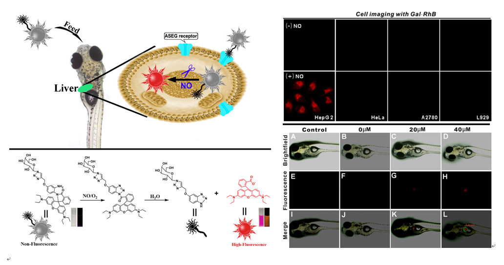 近日,太阳集团tyc539理论有机化学与功能分子教育部重点实验室的张培盛博士研究团队首次报道了一种肝靶向NO荧光探针(Gal-RhB),实现了斑马鱼内肝脏中NO的原位成像检测。Gal-RhB以市售罗丹明B为母体结构,通过将邻苯二胺(NO识别基团)和半乳糖(肝靶向基团)引入罗丹明B结构中,构建了肝靶向NO荧光探针(Gal-RhB)。半乳糖基团的引入不仅增加了探针的水溶性,也有利于探针被肝细胞特异性摄取。细胞和活体成像研究表明:该荧光探针(Gal-RhB)能够被肝细胞特异性摄取,并应用于肝细胞和肝脏中NO的荧光成像分析。该研究对进一步了解NO与肝脏相关疾病的发生发展作用研究具有重要的意义。