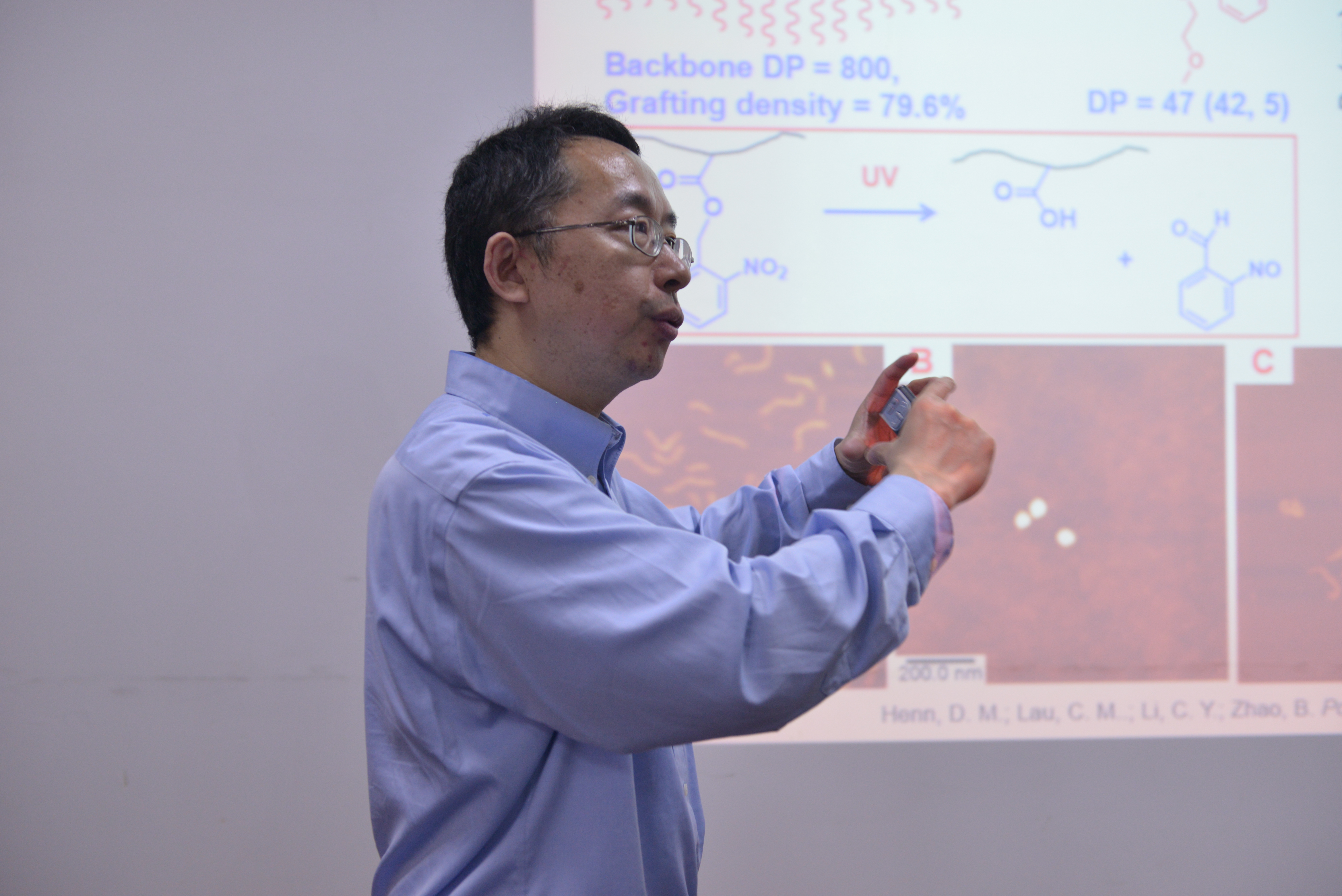 5月6日下午4点,应公司和理论有机化学与功能分子教育部重点实验室邀请,美国田纳西大学赵斌教授在化工楼310学术报告厅,以“Macromolecular Brush Materials(高分子刷材料)”为主题作了一场精彩的学术报告。报告会由理论有机化学与功能分子教育部重点实验室主任唐子龙教授主持,太阳集团tyc539、理论有机化学与功能分子教育部重点实验室师生80余人到场聆听。